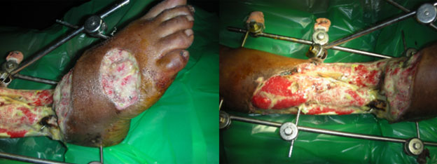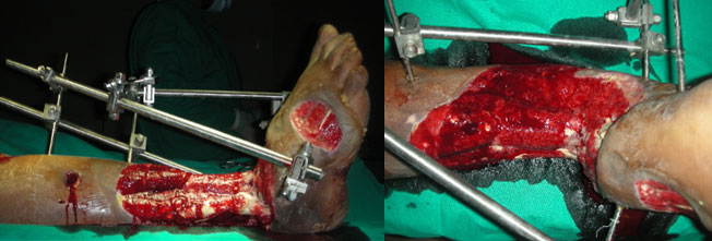 This 50 year old gentleman had a severe crush injury with full thickness skin loss, bone loss and dislocation at the ankle. He was treated initially elsewhere. A Hoffman type external fixator was applied and debridement was done. After about 2 weeks when the infection became uncontrolled he was advised an amputation.