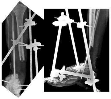 Appearance of the leg after 6 months. All wounds have healed, edema of the leg continues to reduce. Patient walking full weight bearing with the help of a brace to protect the union. He is expected to walk without the brace in another 6 months to 1 year once the fibula has hypertrophied.