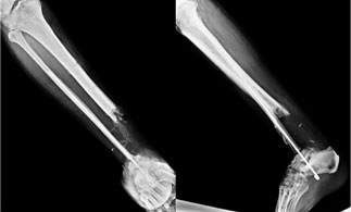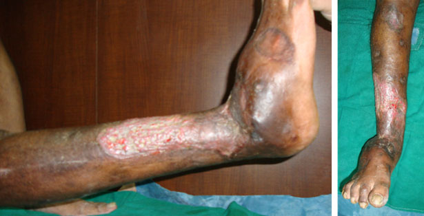When he came to us this was the appearance of the wounds, foul smelling and the distal tibia was necrosed (dead).