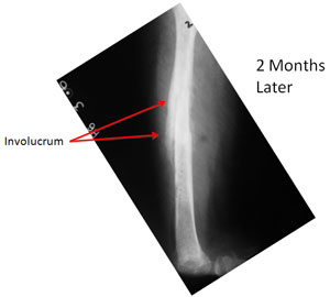 | The infection persisted and there is formation of new bone (Involucrum) around the dead necrotic bone (Sequestrum). |