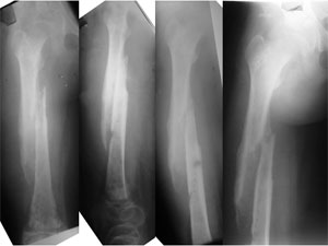 At the time of presentation to us the Infected bone had weakened and broken (pathological fracture). The disuse osteoporosis of the bone is evident in the lower portion of the femur. The salt and pepper kind of appearance on the x-rays can represent a confusing picture of some kind of bone tumor. |