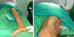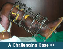 The criteria for removal of the fixator is formation of at least three cortices (out of four-anterior, posterior, medial & lateral). The fixator is removed after gradual disassembly. First the CD unit is removed and clamps are loosened. Patient is then asked to walk for about 10-15 minutes. If there is no pain or trouble then the next step is to remove the rail and clamps, the schanz screws remain in position. Again the patient is asked to walk for 10-15 minutes. Once this step is done comfortably, the schanz screws are removed usually in the out patient department itself. |