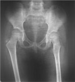 | These pictures were taken in the operating room for better understanding of the rotational deformity. The picture on the left was taken with the foot forward. The picture on the right shows the c-arm picture of the hip joint in the same position. The hip was in extreme internal rotation (normally this would have been in the mid-position, with both the lesser and greater trochanters visible). |