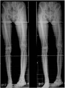 The full length x-ray showing the difference in lengths between the two limbs. The shortening was measured clinically using blocks and palpation of both ASIS (anterior superior iliac spines) and then tallied with the difference on the full length x-ray. |