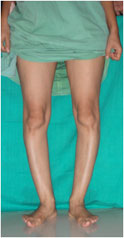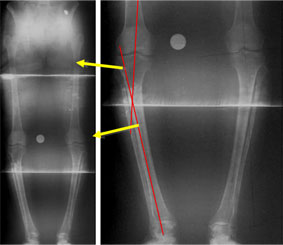 In the example shown here, the patient had a varus deformity of both tibiae (bow legs – reduced angle at the bone below the knee) with slight external rotation deformity of the tibiae (the feet pointing outward while the patellae [knee caps] face forward).