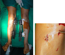 The picture on the left shows how the fixators are applied in staggered manner, so as not to clash with each other. It also shows the corrected rotation – when the patellae are facing forward the feet are also facing forward (the feet were facing outward when placed in similar position).